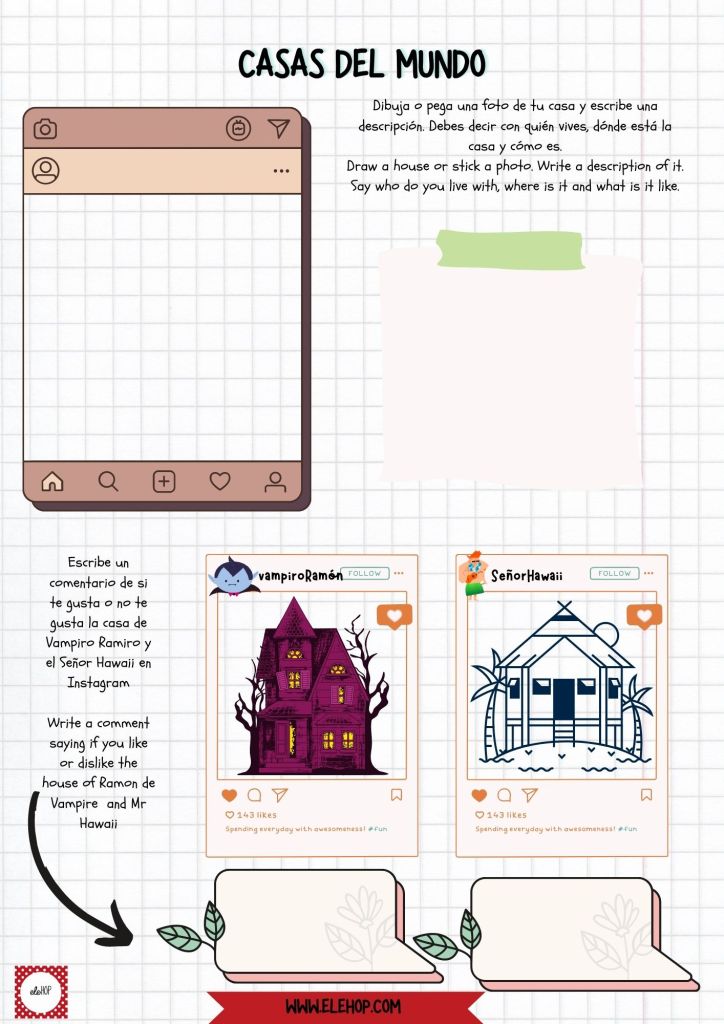 -Propuesta de expresión escrita. Pedirles que completen la plantilla dibujando su casa con su descripción como si se tratara de un post de Instagram. Además, deben comentar los posts de dos instagrammers con sus peculiares casas. (Trabajamos me gusta, no me gusta, me encanta… y las razones)