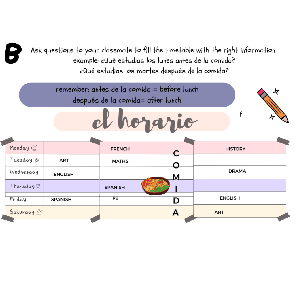 En KS3 y KS4 trabajamos con el vocabulario de las asignaturas escolares en la clase de español en mayor profundidad. Por eso, aunque hacía tiempo ya había subido un recurso para trabajar en parejas hablando de los horarios, ahora he subido a TES un nuevo recurso que está orientado a alumnos un poco más pequeños. Veréis que precisamente por esta razón no he incluido tanta variedad de asignaturas y me he centrado en las más comunes que podemos encontrar de los centros de primaria.