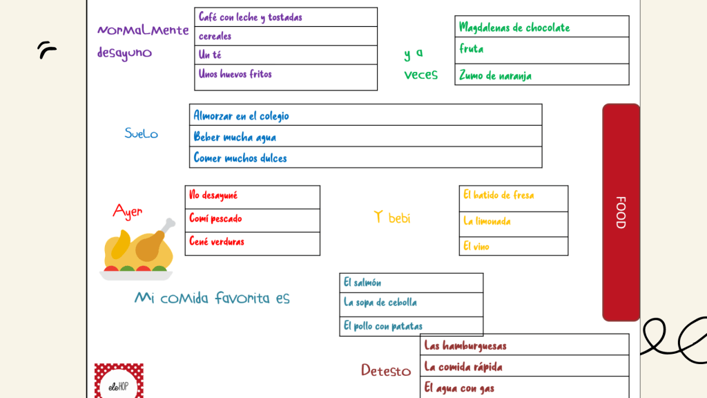 He decidido poner todas las fichas de los temas más importantes que forman parte del GCSE Spanish. Comida, colegio, familia, deporte y tiempo libre, medios de comunicación, tradiciones, compras… en un solo pack. Cada tema tiene dos fichas, una con todas las opciones y otra con huecos para que los alumnos escriban otras respuestas que encajen con los inicios de las oraciones. Gracias a estas plantillas podéis trabajar con el presente, futuro, pasado y condicional.